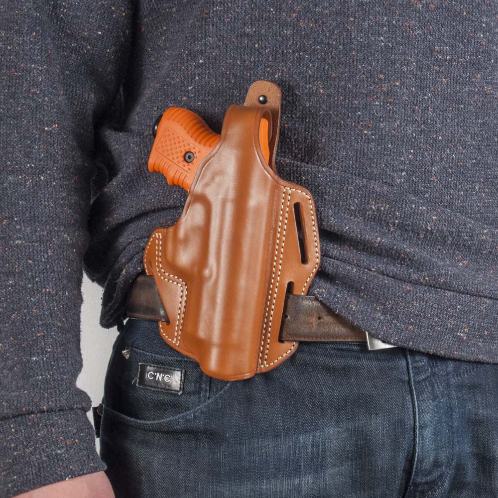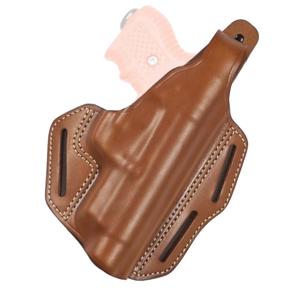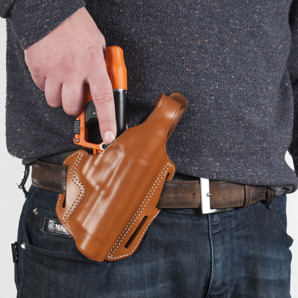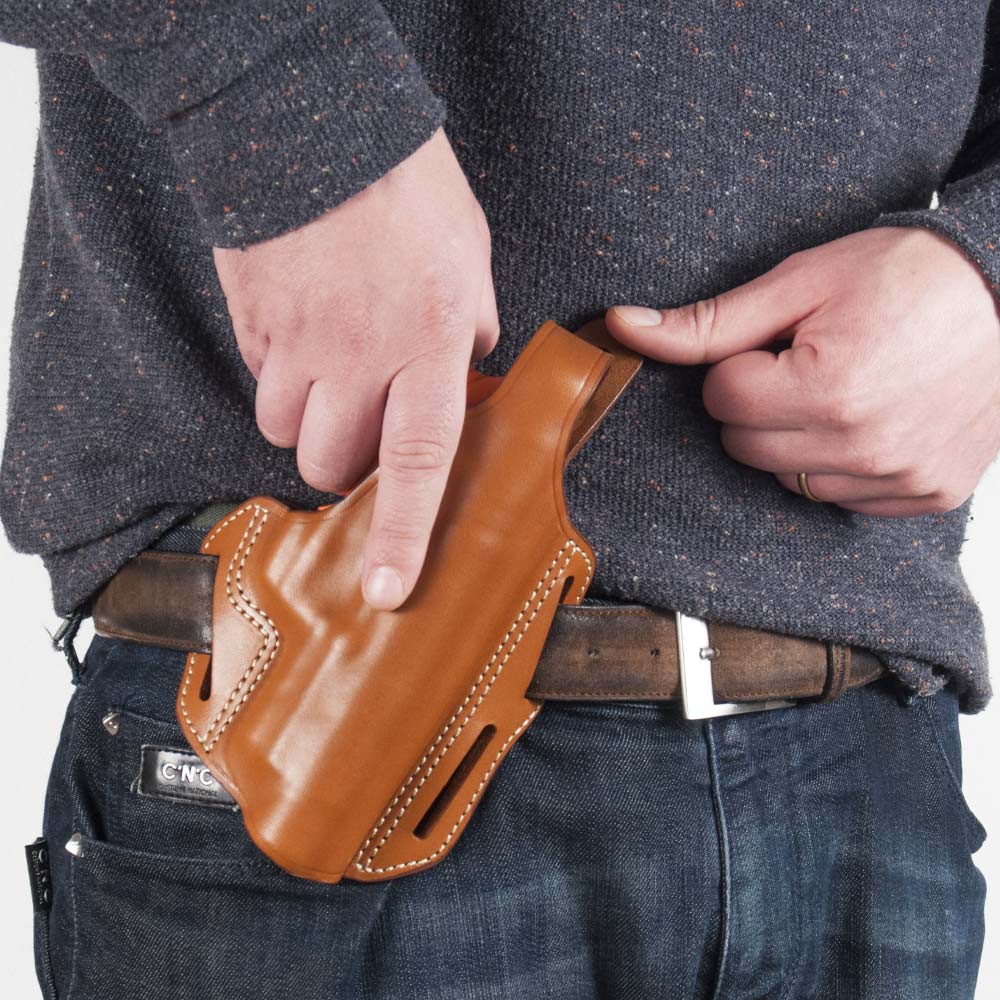 Fondina in cuoio di prima scelta lavorato a mano. Da agganciare in cintura e posizionare in 3 modi diversi, grazie a tre asole laterali. Un laccio di sicurezza resistente all'usura con leva di sgancio irrigidita consente di estrarre la fondina in modo facile, veloce e sicuro.