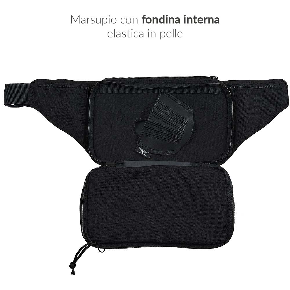 Il marsupio è dotato di 5 scomparti portaoggetti e documenti; spazioso, versatile e con apertura rapida. Oltre agli scomparti principali è dotato di tasche laterali per contenere piccoli oggetti.