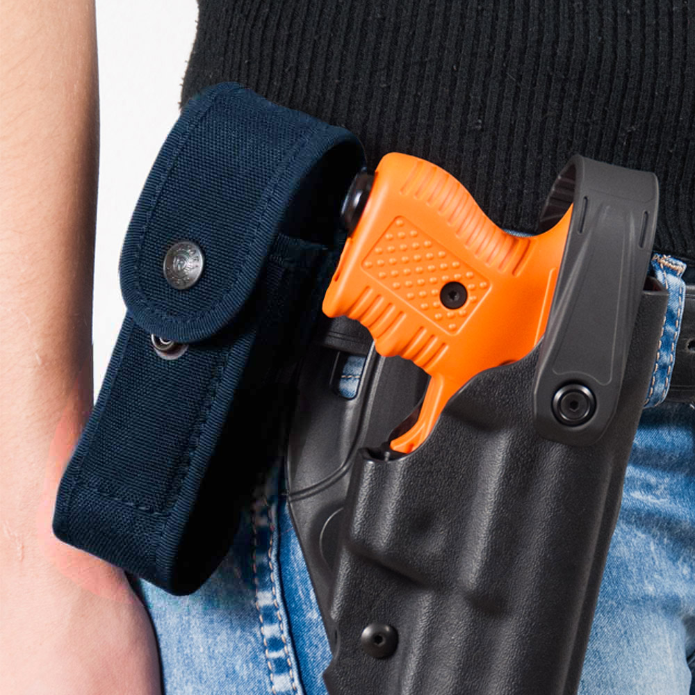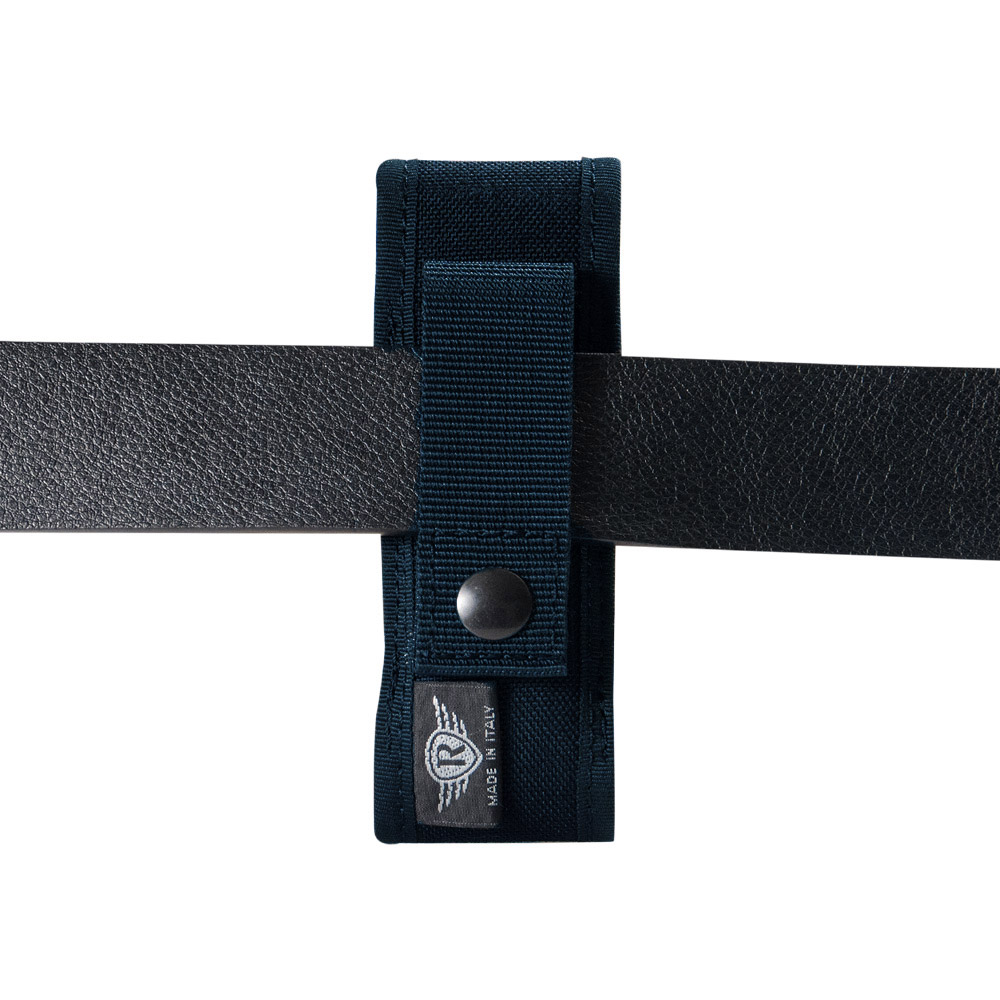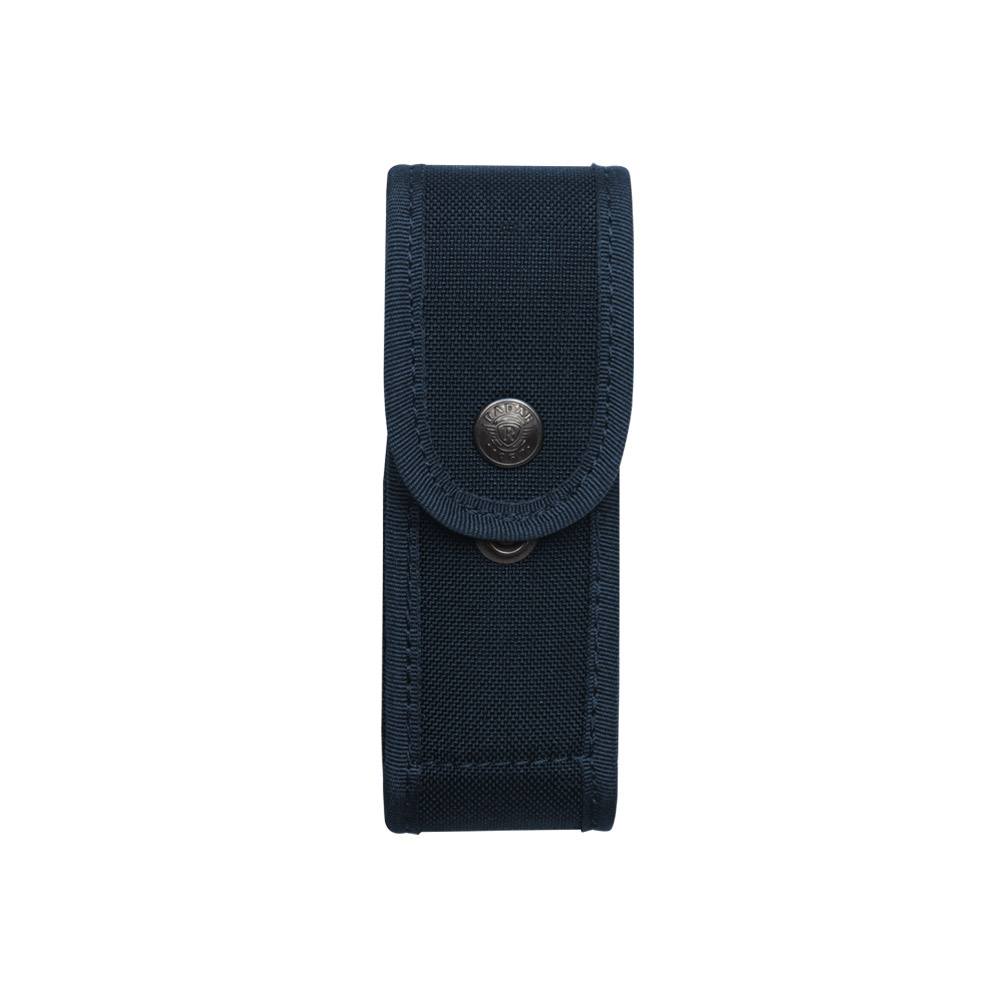 Porta caricatore realizzato in Cordura blu, un tessuto resistente allo strappo e all'abrasione. con clip di chiusura a doppia posizione, fascia in velcro e bottone per l'aggancio in cintura. La clip di chiusura assicura l'ottima tenuta della cartuccia di ricarica.
